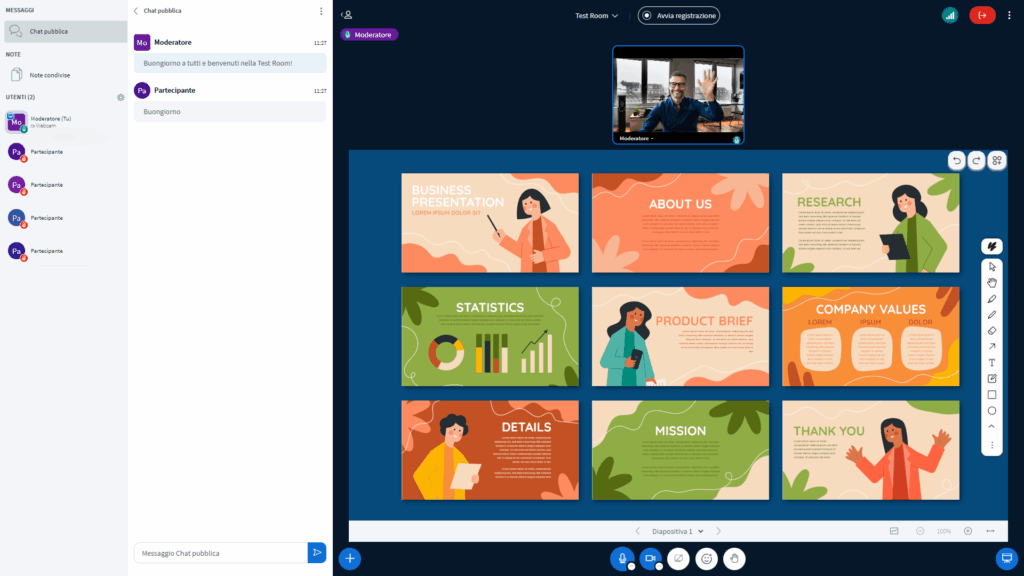 Funzionalità collaborative come lavagna multi-utente, stanze separate, sondaggi e chat favoriscono la partecipazione attiva e l’apprendimento condiviso.