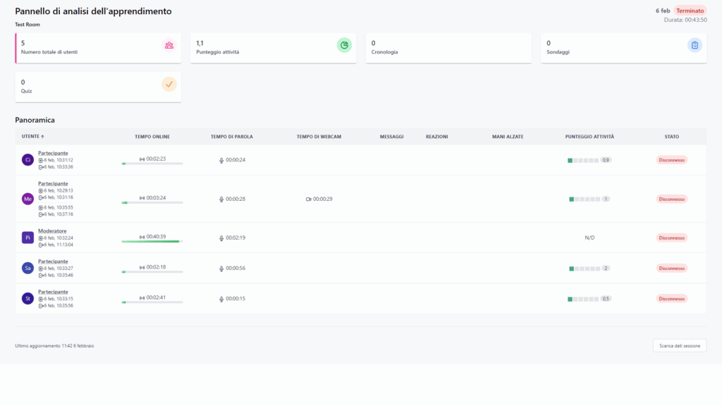 Per ogni sessione vengono generati report dettagliati che consentono di monitorare la partecipazione in modo preciso. I tracciati possono essere personalizzati in base a un modello predefinito e includere dati aggiuntivi, in base alle necessità.