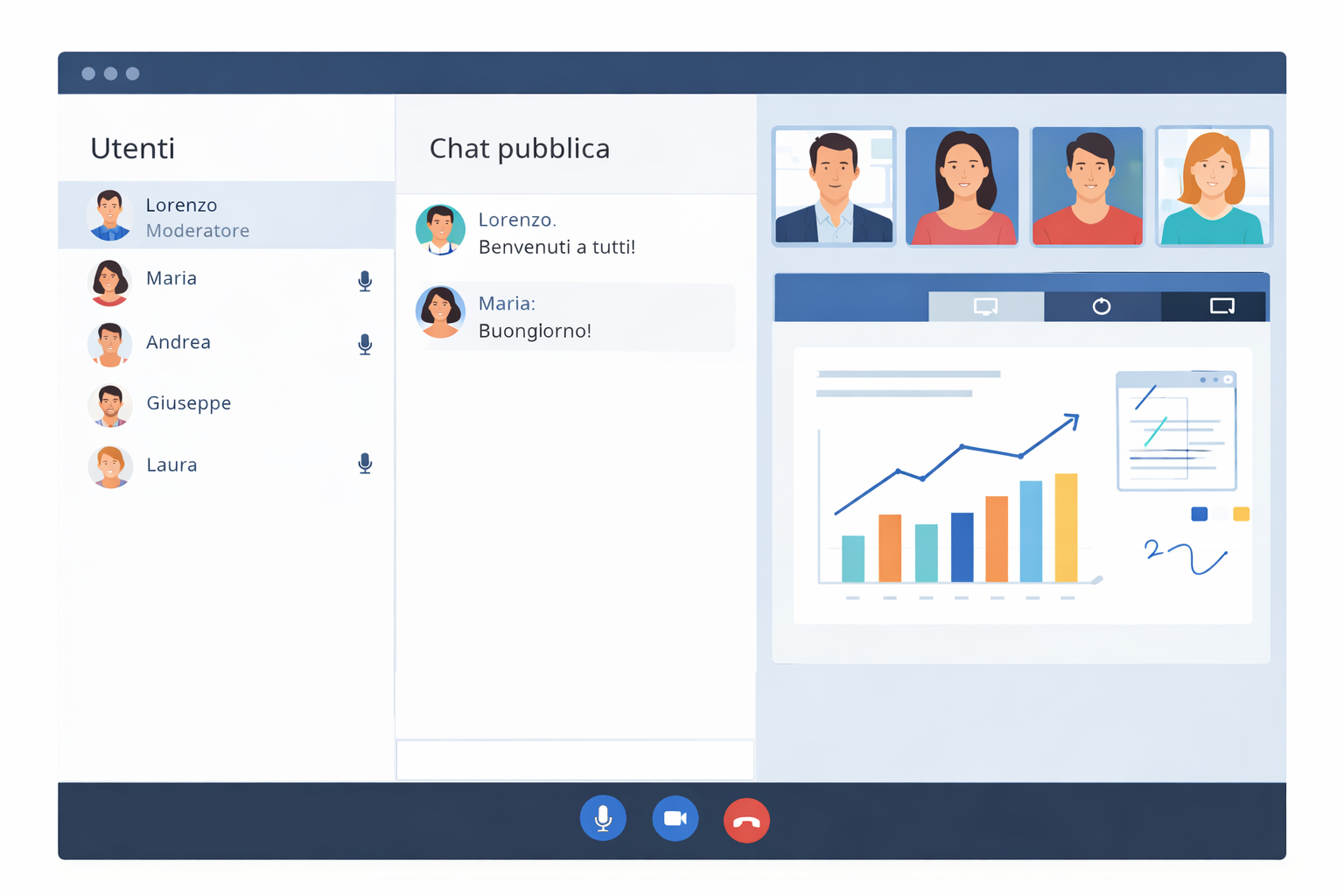 L’interfaccia è chiara e immediata, consentendo a chi insegna di concentrarsi sulla lezione e a chi partecipa di seguire e interagire senza difficoltà tecniche.